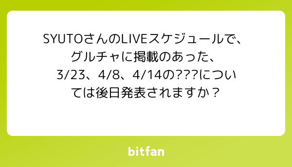 質問 匿名希望 2026/01/23 00:45 Bitfan IDでログイン パスワードを忘れた方はこちら ログインできない場合 ログインしたままにする または Xでログイン Facebookでログイン Bitfan IDとは Bitfan IDを未登録の方 Bitfan IDとは何ですか Bitfan IDは本サービスを利用するために必要なアカウントとなっております。 外部SNSアカウントを利用したご登録、または任意のメールアドレスとパスワードを利用したご登録ができます。 質問・リクエストを送る URLをコピーする 報告する